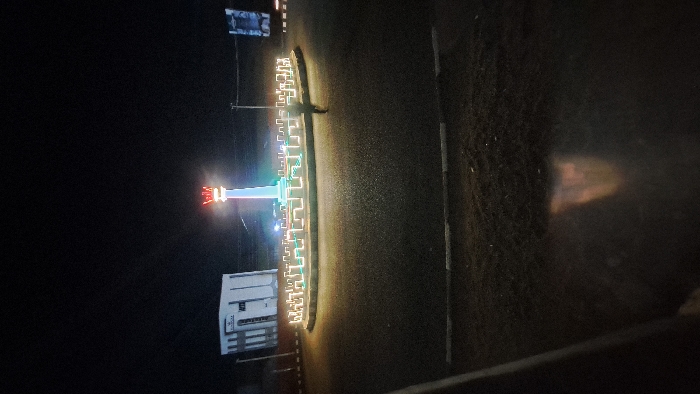 - "A lit tower structure with a red top is surrounded by an illuminated, square-patterned fence on a road at night" by FM-KkRMD2, licensed under CC BY 4.0