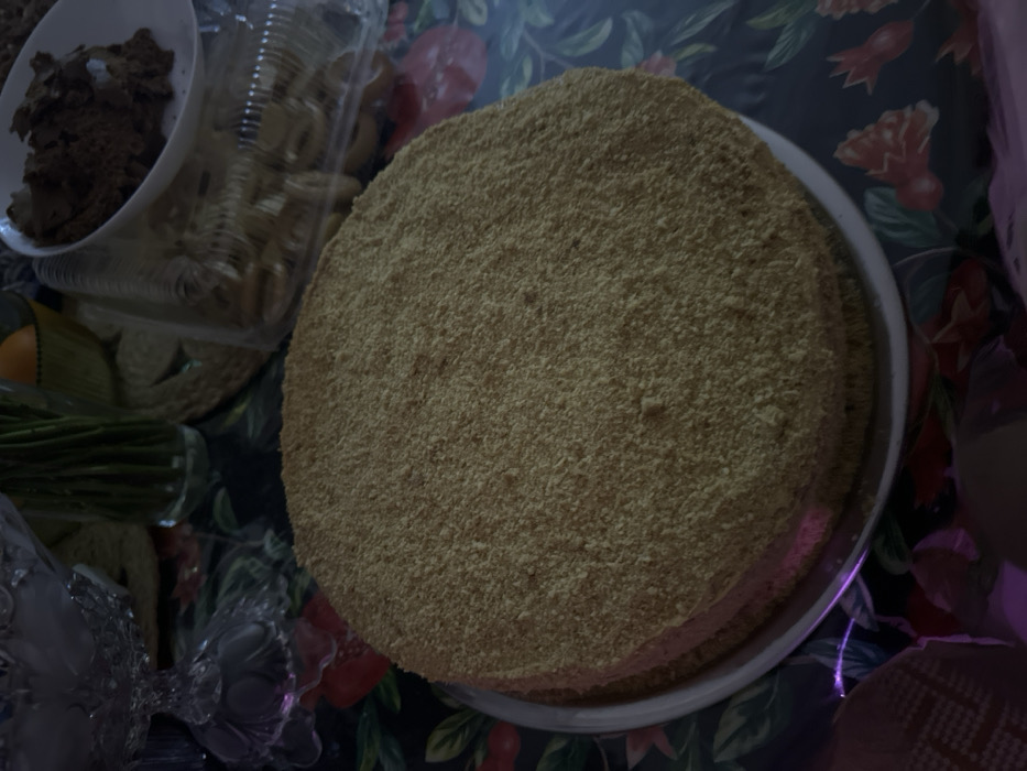 A round, layered cake sits on a white plate, covered in fine, golden-brown crumbs. Beside it, a bowl filled with crumbled cake and a plastic container of round pastries are visible. The background shows a dark, patterned tablecloth with floral motifs. Other elements include an orange, green stems, and what appears to be decorative crystal objects.
