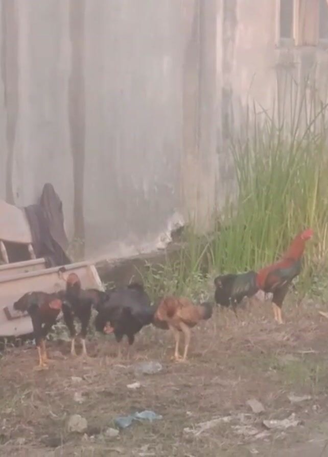 group of chickens in a grassy area next to a concrete wall. There is a rooster with red and black plumage standing near some tall grass. Several other chickens, some black and some brown, are pecking at the ground. A white metal object and a dark cloth are visible near the bottom of the frame. The video is slightly blurry and the perspective is tilted.