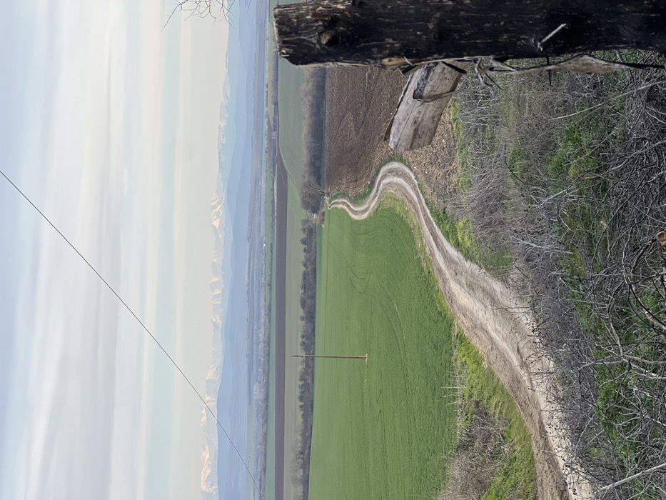 The image displays a panoramic rural landscape near Slatina, Bulgaria, captured from an elevated perspective. The immediate foreground features dry, thorny vegetation and, on the right, a dark, weathered wooden post or tree stump with a protruding branch. A winding, unpaved dirt track descends from the foreground through the midground. To the left of the track is an expansive field of vibrant green crops, containing a single, tall utility pole. To the right of the track, an equally large field of tilled brown earth is visible. A line of sparse trees or bushes marks a transition zone in the mid-distance. The background consists of successive layers of agricultural land, including green and tilled sections, receding towards distant, hazy hills. Beyond these, a prominent range of snow-capped mountains extends across the horizon. The sky is largely overcast with light gray and white clouds. A thin, dark cable or wire traverses the upper left portion of the frame. No human figures or active subjects are present.