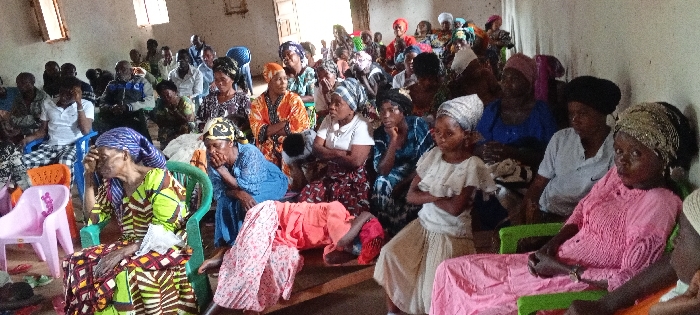 An indoor gathering is depicted in Konongo, Democratic Republic of the Congo