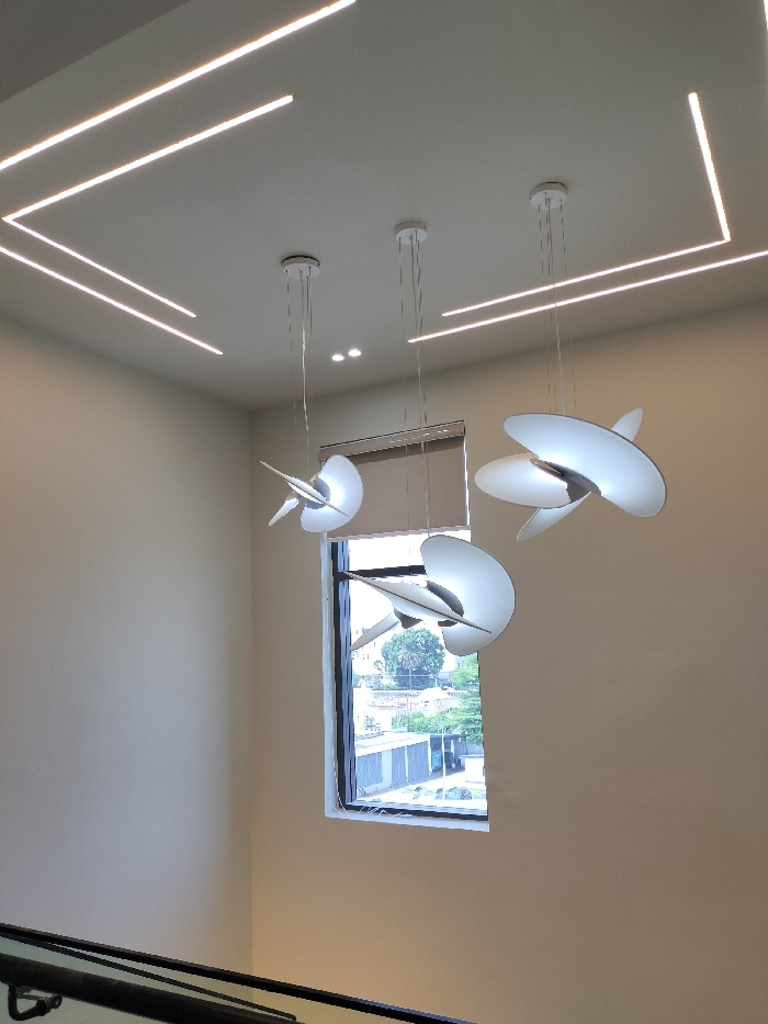 An interior architectural space in Falomo, Nigeria, is depicted, viewed from an elevated perspective. The light-colored ceiling features illuminated linear LED strips arranged in a geometric pattern, alongside two small recessed downlights. Four contemporary pendant lights, each composed of multiple layered, curved matte white elements, hang at varying heights and are illuminated, emitting a soft glow. The walls are plain and light-beige. A tall, rectangular window, partially obscured by a brown roller blind at its top, provides a view of an urban exterior. This exterior includes building rooftops, lush green trees and foliage, and other distant structures. In the bottom-left foreground, a dark-colored handrail, indicative of a staircase, is partially visible, extending diagonally upwards. No individuals are present in the scene.