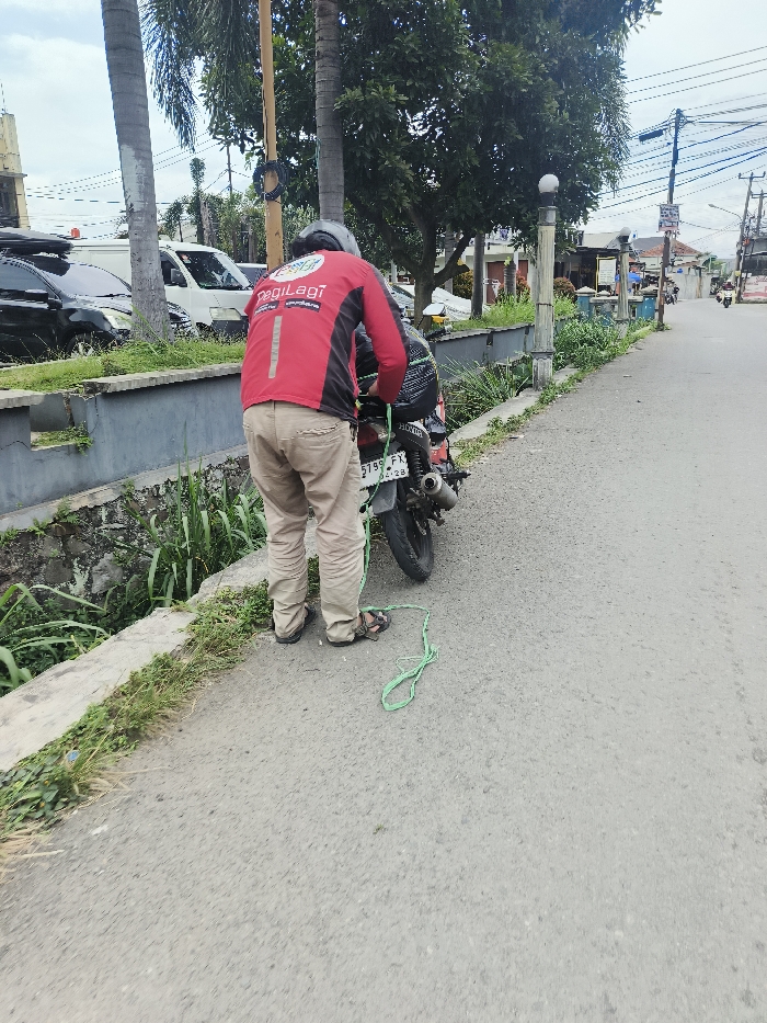 A person in a red and black "PegiLagi" jacket ties green string to the back of a parked motorcycle. The license plate reads "5799 FX." The motorcycle sits on the side of a road next to a curb and a ditch. The person wears tan pants, sandals, and a helmet. Trees, utility poles, and buildings are visible in the background.