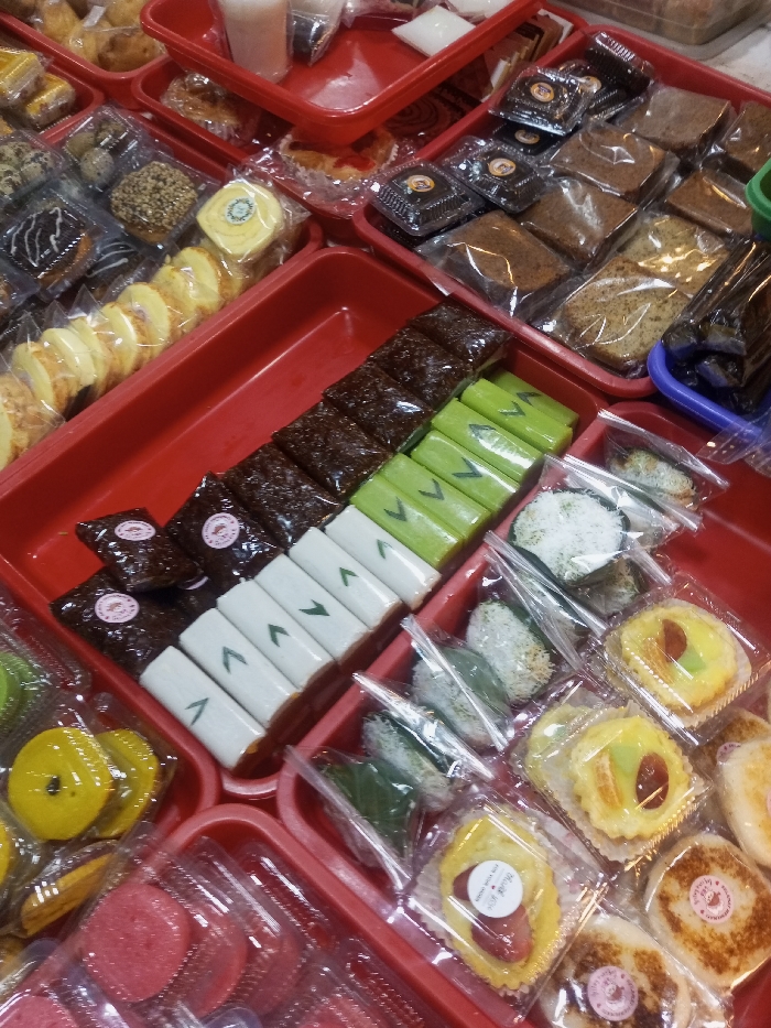 This image displays a high-angle view of a meticulously arranged assortment of individual snack portions, likely for sale, located in Lê Thanh Nghị Ward, Vietnam. The scene is dominated by multiple red plastic trays, each containing various types of sweets, cakes, and pastries, all individually packaged in clear plastic wrap, bags, or small transparent containers. Prominent items include: * Rows of dark brown, glossy, rectangular blocks, likely a type of sticky rice cake (kueh or dodol), individually wrapped in clear film. * Adjacent to these are rows of light green rectangular blocks, also individually wrapped, and white rectangular blocks featuring a green 'V' or leaf design. * Numerous small, round, yellowish tarts or pies, some topped with fruit or jam, are presented in clear plastic cups with paper liners. Several of these tarts display small, circular, brand-specific stickers. * Slices of yellowish rolled cake, often resembling a Swiss roll, are individually wrapped in clear plastic. * Small, round, white items, possibly rice cakes or glutinous rice balls, some coated in shredded coconut, are contained within clear plastic bags. * Various square or rectangular plain cakes and loaves, appearing dense and brownish, are also visible in clear plastic packaging. * Towards the upper left, smaller pastries and buns are displayed. In the upper center, small cups or pouches contain light pink and white liquids, also individually sealed. * In the lower right, multiple small, round, browned items resembling mini pancakes or fritters are present, some marked with pink circular stickers. No individuals or active interactions are visible. The items are presented in an organized manner consistent with a retail food display or market stall.