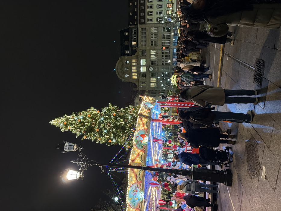 - "A nighttime scene features a tall, brightly lit Christmas tree next to a carousel adorned with candy cane striped poles and colorful decorations" by FM-e1pJ93, licensed under CC BY 4.0