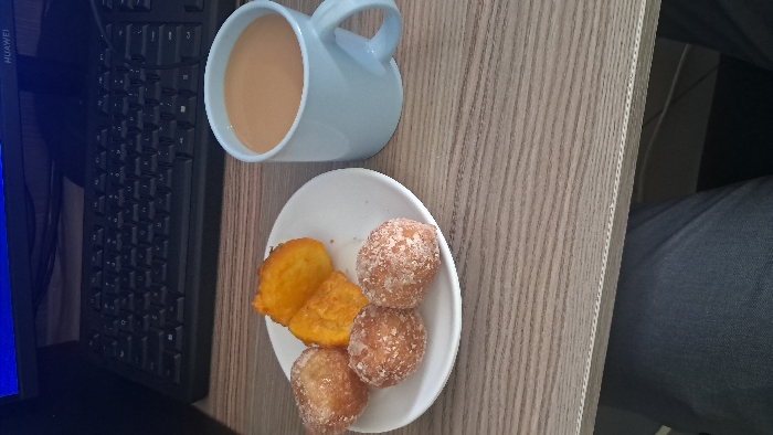 An indeterminate indoor location in the city of Unknown, Unknown, shows a light-brown wood-grain desk surface from a high angle. In the midground, a white circular plate holds five food items: three spherical, sugar-coated, light-brown pastries, and two irregular, deep-orange-yellow, fried pieces. To the right, a light-blue ceramic mug contains a light-brown liquid. The background features a black computer keyboard and a black computer monitor displaying a blue screen, with a faint "HUAWEI" logo visible on the monitor's top right bezel. The foreground reveals the upper thighs and lap of an individual wearing dark blue denim trousers. No active interactions or explicit actions are observed.