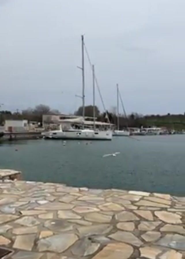 The video depicts a harbor with several sailboats docked. The water is slightly choppy, and several seagulls are flying nearby. The foreground is a stone walkway. The sky is overcast, suggesting a cloudy day. There are some buildings and trees visible in the background.