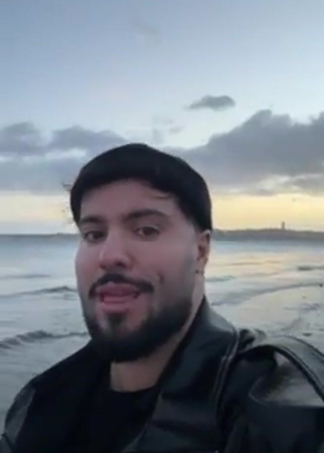 A close-up shot presents a man in a black beanie and black leather jacket, against a beach backdrop. He's facing the camera with a slight smile, his face partially obscured by a beard. The scene is set outdoors near a beach with visible waves and a partially cloudy sky. In the background, there's a suggestion of a city skyline or structures across the water. The man's expression changes from a smirk to a more pronounced smile towards the end of the clip.