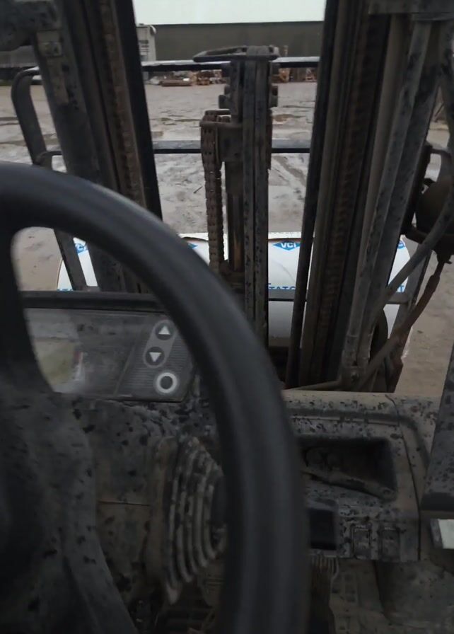 close-up, point-of-view shot from inside the cab of a dirty forklift. The viewer is looking out through the forklift's mast, which is composed of multiple vertical metal beams and chains. A hand is visible briefly on the black steering wheel. The instrument panel is dirty and has a few buttons. The ground outside is wet, and a building and some construction materials are visible in the distance. The overall scene appears to be a construction or industrial site.