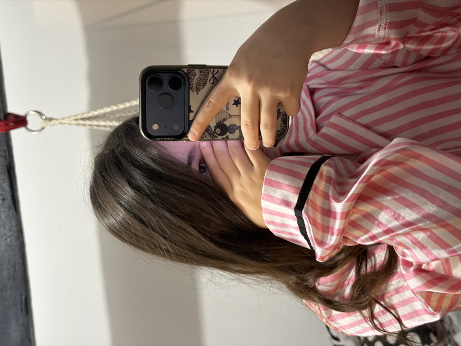 A person in pink and white striped pajamas stands in front of a mirror, holding a smartphone up to obscure part of their face. The phone has a patterned case featuring cartoon-like illustrations. The person's brown hair partially covers their face. The reflection shows a white wall, a dark structure with a hanging ring, and a string attached. The camera's lenses and a section of the phone case are clearly visible.