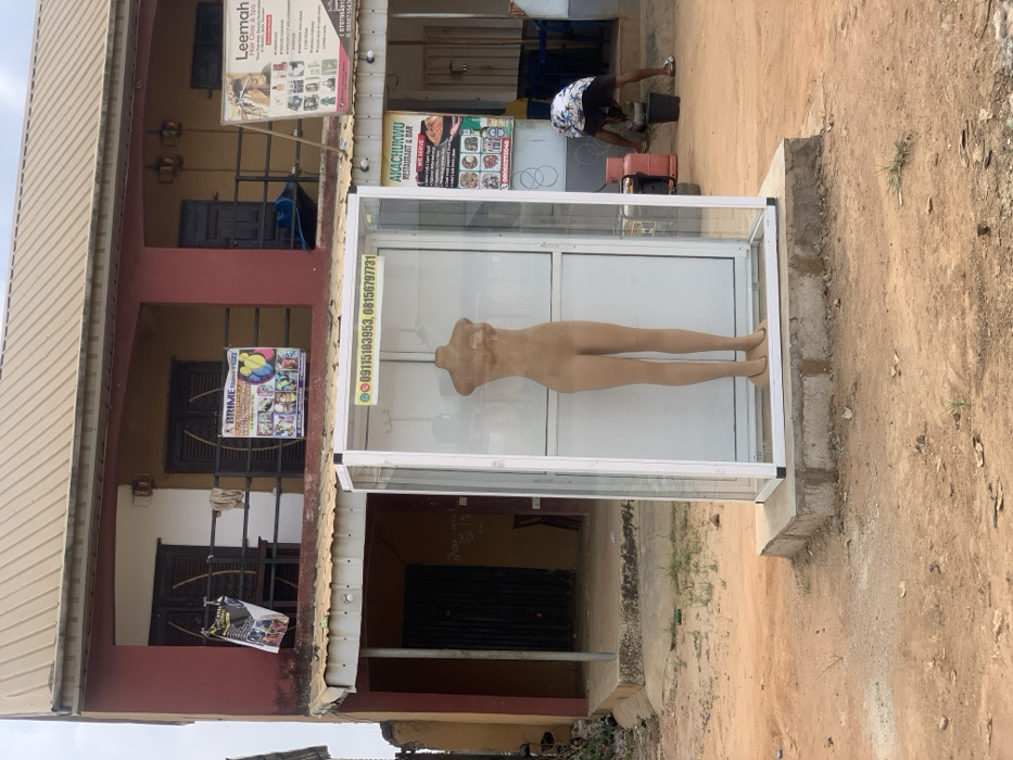 The image depicts an outdoor commercial scene in Unknown, Unknown. A headless, nude, light-tan female mannequin stands inside a transparent glass and white aluminum display case, which is centrally positioned on a raised concrete base in the foreground. Two phone numbers, "09115103953" and "08156797731", are affixed to the interior rear panel of the display case. In the background, a two-story building with a brown corrugated metal roof features red-brown and white painted walls. The ground floor houses commercial establishments, including "AKACHUKWU RESTAURANT & BAR" and "LEEMAH" (a beauty/fashion business), identified by their respective signs. The upper floor has a balcony with black metal railings, from which two posters, one promoting "BRIME 's TALENT PAGE," and a piece of light-colored fabric are hanging. To the right of the mannequin display, an adult male, clad in a patterned short-sleeved shirt, dark shorts, and light-colored flip-flops, is bent over a black bucket placed on the reddish-brown dirt ground. His hands are submerged in the bucket, suggesting he is washing an item. A red gas cylinder stands behind him, near the building. The ground surrounding the structures is unpaved dirt with minimal vegetation. The scene is under diffused light, indicating an overcast sky.