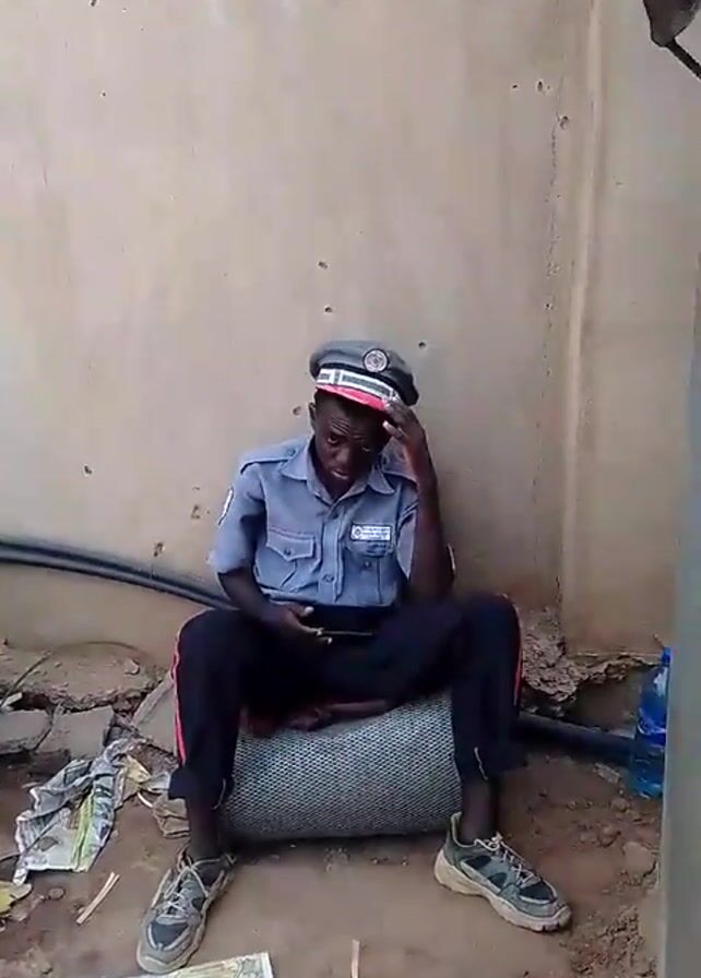 A man in a police uniform is sitting on a round, woven object outdoors, against a light-colored wall. He is wearing a light blue, short-sleeved shirt, dark pants with red stripes down the sides, and gray and black sneakers. He also wears a police cap. He looks at the camera briefly, then looks away. The area around him contains debris including a corrugated metal sheet, pipes, scraps of newspaper, and pieces of wood. The ground is dirt. The scene is brightly lit.