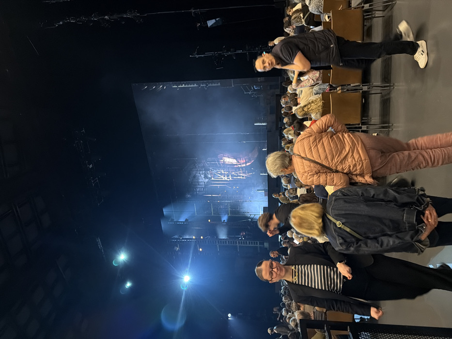 The image depicts an indoor performance venue in Boulogne-Billancourt, France. The scene captures audience members within a darkened hall, orienting towards a brightly lit stage in the background. The stage features a complex set design with large dark panels, scaffolding-like structures, and a central element displaying an abstract or structural motif. Multiple bright blue stage lights illuminate the stage and atmospheric haze. In the immediate foreground, four individuals are prominent: A woman with dark hair and glasses, wearing a black blazer over a black and white striped shirt and black pants, walks left. Adjacent to her, a blonde-haired woman, viewed from behind, stands wearing a dark blue denim jacket. To her right, an older woman with short grey hair, also seen from behind, walks right in a light peach-colored puffer jacket and matching pants. On the far right, a man with dark hair, attired in a black short-sleeved shirt, black vest, black pants, and white sneakers, stands facing right with his left hand near his ear. Multiple rows of brown upholstered seats, occupied by numerous additional audience members, extend into the mid-ground and background, all facing the stage. The ceiling is dark, revealing overhead lighting rigs.