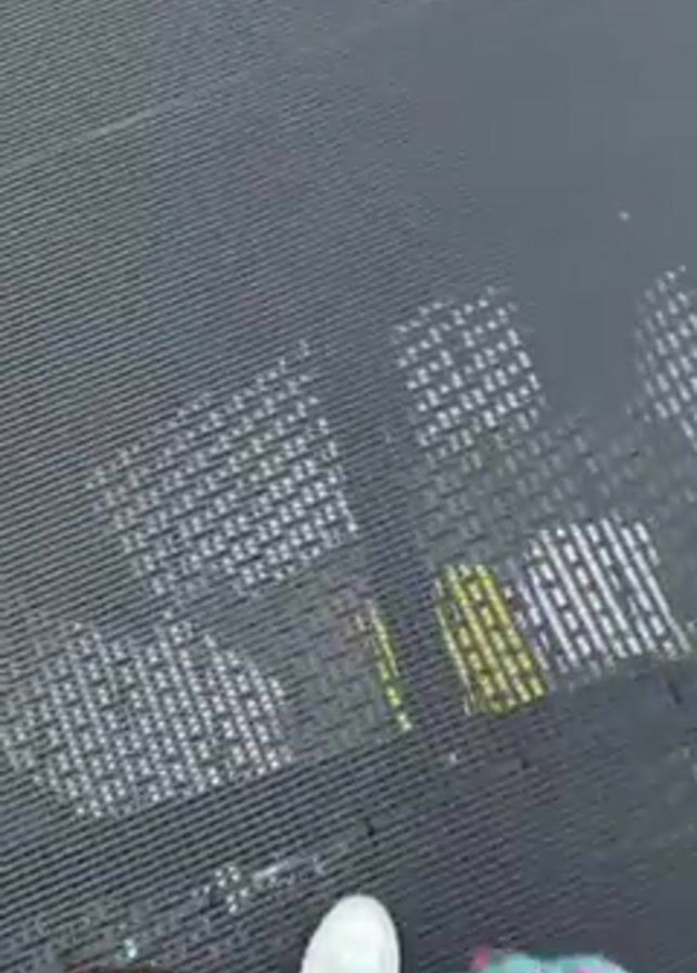 The video starts with a close-up of a person's foot in a white sneaker walking on a surface that has a patterned grid