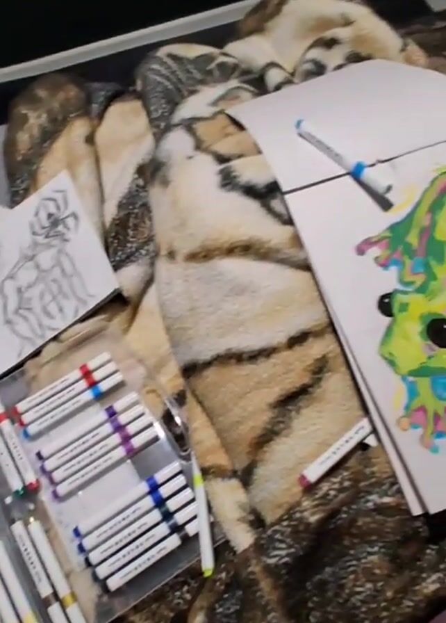 collection of art supplies and artwork on a patterned blanket. A set of markers in a clear plastic case is visible, along with several loose markers scattered around. Two sketches are present: one of a bird and butterfly and another unfinished sketch. Additionally, there are two completed drawings: one of a green and blue tree frog and one of a blue whale with a ship in the background. The environment appears to be indoors, possibly on a bed or couch.