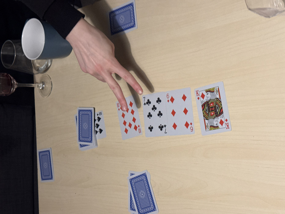 - "On a tan surface, a selection of playing cards are scattered, displaying a game in progress or a hand being dealt" by FM-gH53j1, licensed under CC BY 4.0