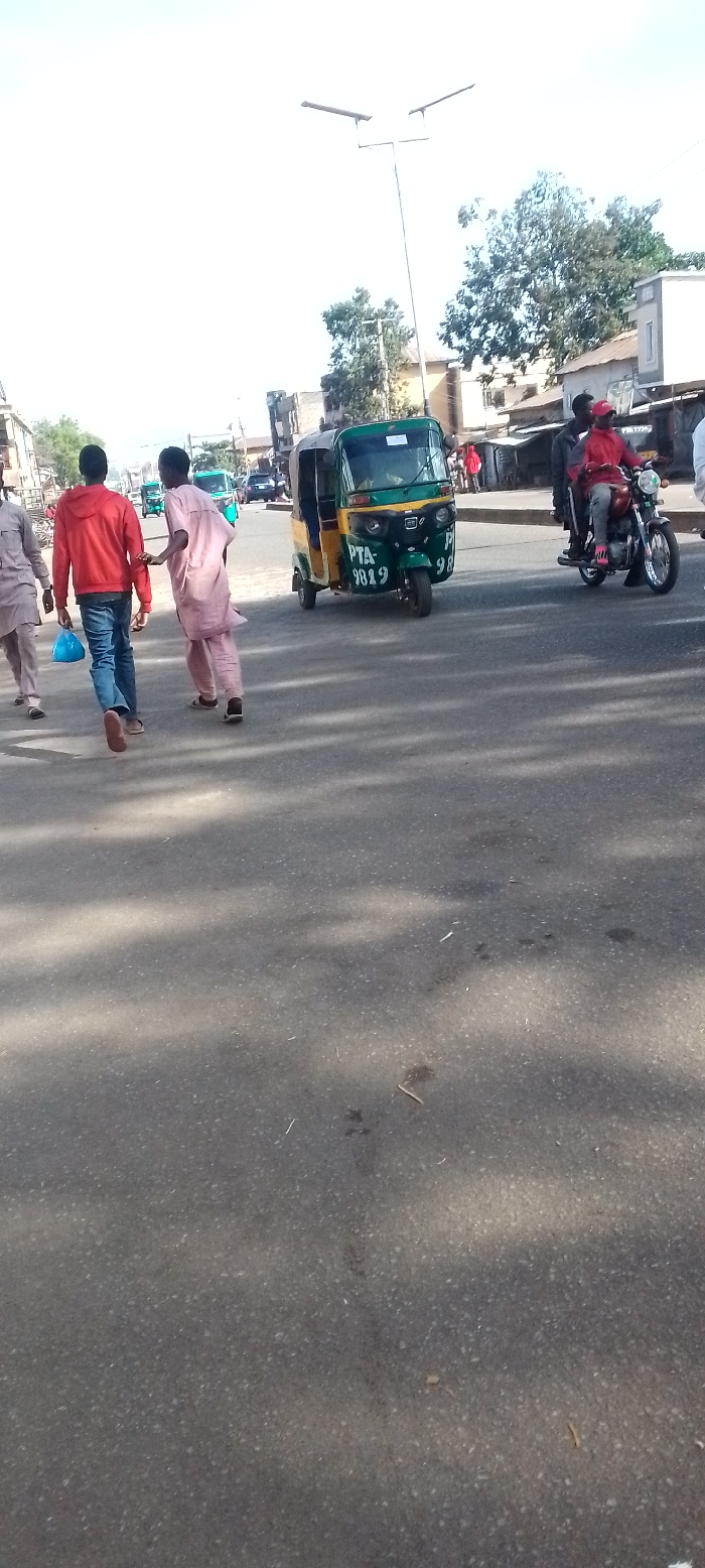 A sunlit street scene captures a diverse array of vehicles and pedestrians. A green and yellow auto-rickshaw prominently displays "PTA-9019". Nearby, a motorcycle carries two individuals, the passenger in a red top and cap. Three pedestrians walk away from the camera, one in a red hooded sweatshirt and jeans, another in a light pink traditional outfit. A light post with twin lights stands tall in the background, amidst buildings and trees under a clear sky.