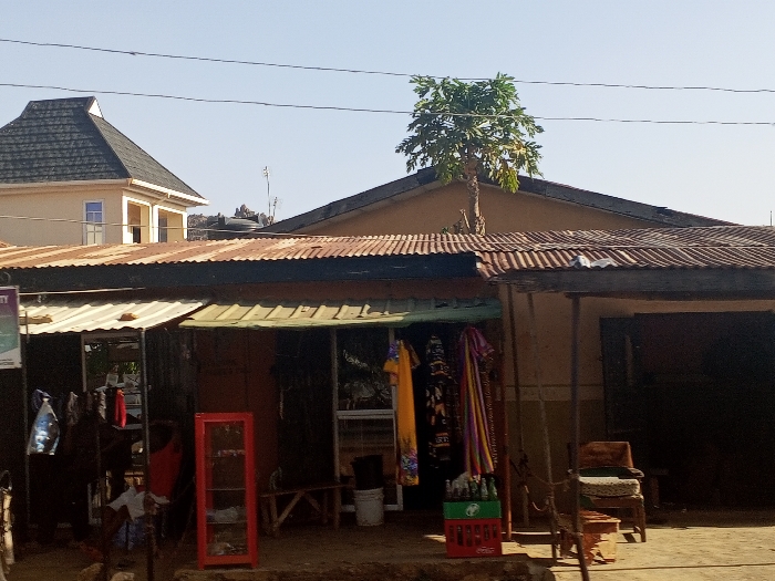 The scene depicts an outdoor commercial area on Rukuba Road, Nigeria, under bright daylight. In the foreground, a single-story building with a rusted corrugated metal roof features multiple shopfronts. An awning made of similar material extends forward. From the roofline of this building, a papaya tree with green foliage is visibly growing. On the left side of the foreground, clothing items are displayed, including a yellow garment, dark patterned fabric, and a colorful striped fabric. A red, multi-shelf display cabinet stands near the entrance, beside which a small child, wearing a white top, is seated on the unpaved ground. Blue plastic bags hang nearby, and a white bucket is visible. Towards the center, a crate containing multiple green-bottled beverages is positioned on the ground. Metal poles support an overhead structure or awning. On the right, an open doorway leads into a dark interior. An old wooden armchair with a patterned cushion is placed outside this doorway, accompanied by a small stool. In the background, a two-story, light-colored building with a dark, patterned gabled roof is visible. It features an open balcony on the second floor with two pillars and a light blue window on the first floor. Overhead utility wires traverse the clear sky.