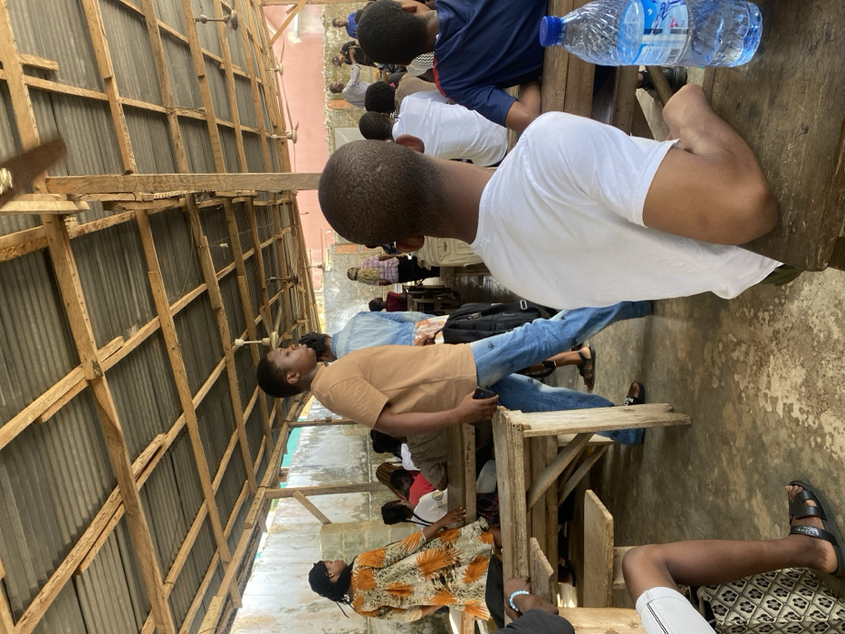 This image depicts a semi-enclosed communal gathering space in Ibadan, Nigeria, featuring a corrugated metal roof supported by a robust wooden beam and post structure