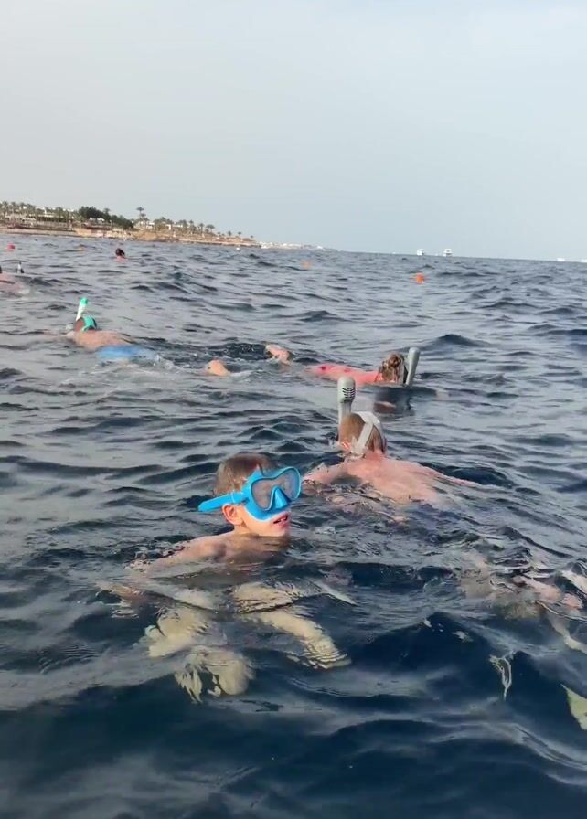 Several people are swimming in the ocean near a coastline. The focus is on a young boy in the foreground, wearing blue goggles, who is smiling and paddling in the water. He is surrounded by other swimmers, all wearing snorkeling masks. The water is a dark blue, with small waves. In the distance, the coastline is visible, with buildings and palm trees. Other people are swimming farther out in the water, marked by buoys. The sky is overcast and a light gray.