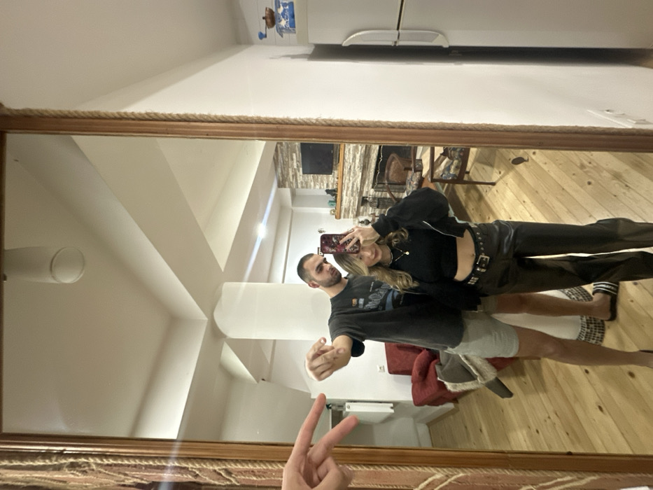A couple takes a mirror selfie. The woman holds up a phone, wearing a black crop top and dark pants with a prominent belt. The man stands beside her in a dark t-shirt and shorts. They're reflected in a large, rectangular mirror with a rope-like frame. The room behind them has light wood floors, a fireplace, and a white ceiling with beams. A hand with fingers raised in a peace sign is visible at the bottom of the frame.