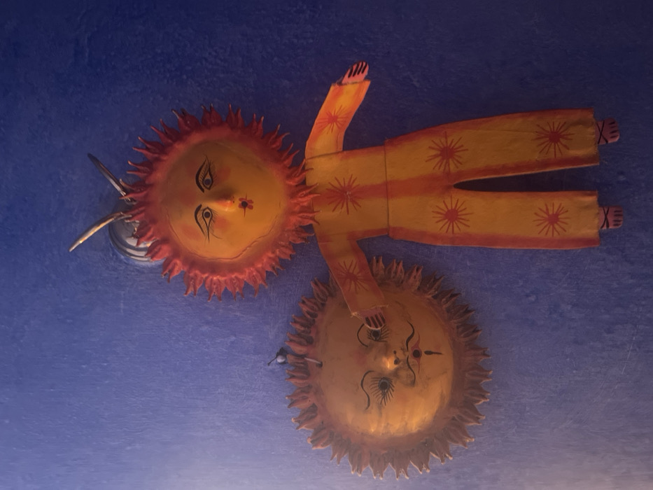 Two sun-themed ceiling decorations adorn a blue surface. The upper one has a painted face and a body-shaped appendage extending outward, resembling a person in a suit, decorated with orange stars. The lower sun-like figure also has a painted face but without body parts. A lighting fixture is positioned beside the first sun. The decorations appear handmade.