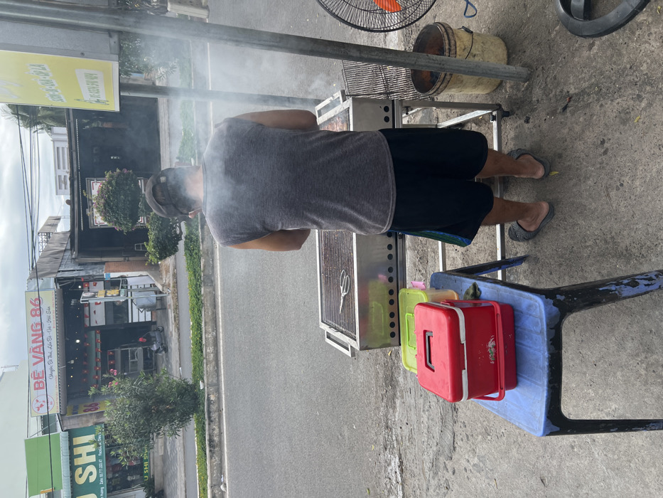 A man in a grey tank top, black shorts, and slides stands in front of a smoking grill on a sidewalk. A red cooler, and a green container, sit on a blue plastic chair next to the grill. A bucket and an orange fan are nearby. In the background, there's a street with shops and buildings. Smoke from the grill rises into the air.