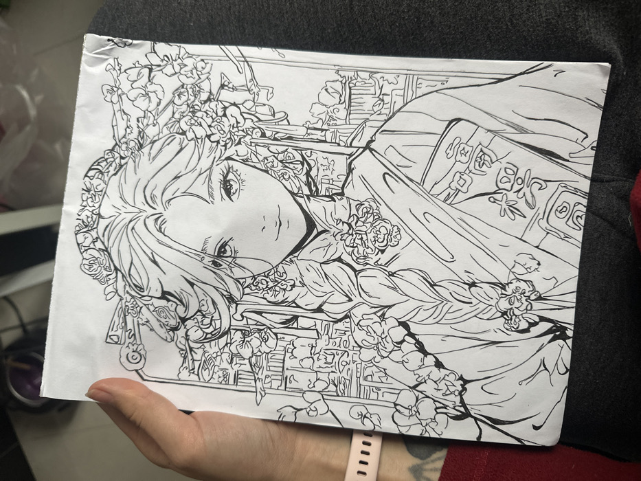 In an indoor setting in Yiwu, China, a person's light-skinned hand holds a vertical sheet of white paper displaying a detailed black and white line art drawing. The drawing portrays a young female figure from the torso up, rendered in an East Asian anime/manga art style. The figure features long hair styled into a prominent braid over her proper left shoulder, with additional hair cascading around her face. Her hair is intricately adorned with numerous floral elements resembling orchids, forming a decorative crown and integrated into her coiffure. She has large eyes with distinct eyelashes, a small nose, and a gentle smile. Her clothing is a traditionally inspired East Asian garment, with wide sleeves and layered details. Visible Chinese characters are present on the proper right side of her chest area, alongside further floral embellishments on her attire. The background within the drawing depicts additional floral motifs and abstract architectural outlines. The white paper exhibits a slight crease on its top right corner and minor imperfections along its cut edges. The hand holding the paper displays manicured nails and a pink digital watch on the wrist, with a tattoo partially visible on the forearm. The immediate environment consists of a dark, textured surface, likely fabric, behind the held paper.
