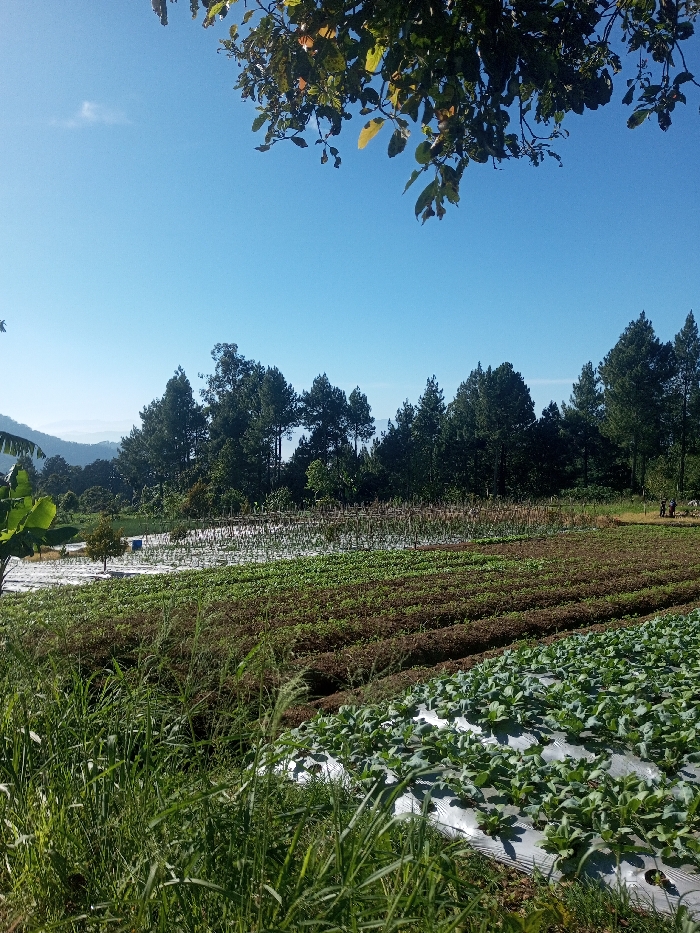 This image depicts an agricultural scene located in Phonethan, Laos, under a clear blue sky. The upper portion of the frame is dominated by a bright, cloudless blue sky, partially obscured at the very top by dark green foliage and branches. The foreground features tall, wild green grass and weeds. Immediately beyond the grass, cultivated fields extend into the mid-ground. To the right, rows of small, green, leafy plants, consistent with young cabbage or similar vegetables, are planted in raised beds covered with white plastic mulch. Adjacent to these, a section of fields contains rows of reddish-green plants growing directly in tilled soil. Further back, more cultivated rows appear, with some sections also utilizing white plastic mulch for the plants. A dense line of tall, dark green coniferous trees forms a distinct boundary behind the cultivated fields. To the far left, a large green banana plant is visible. On the far right, near the tree line, two indistinct figures or objects are present, indicating potential human activity. In the distant background, hazy outlines of mountains or hills are visible beneath the clear horizon. The scene is brightly illuminated by sunlight, consistent with daytime conditions.