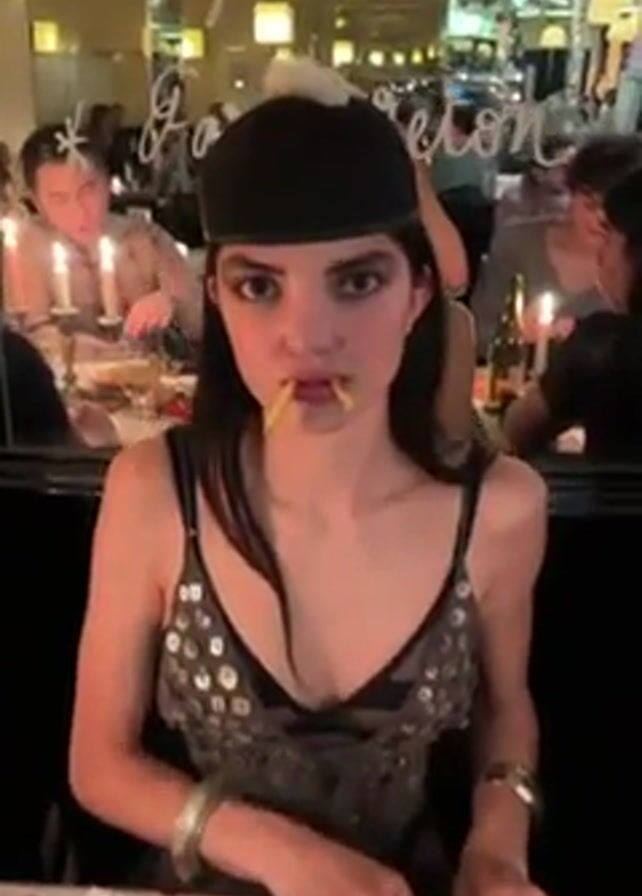 The video features a young woman with pale skin, dark hair, and dark eye makeup, sitting at a table in what appears to be a crowded restaurant. She is wearing a low-cut top with reflective circular accents and a black hat with a small white pom-pom on top. She has two french fries held between her lips, and she is looking directly at the camera with a serious expression. On the table in front of her, there is a mostly empty plate with a red and white rim, a small dish with a yellow substance in it, a bottle of Coca-Cola, and some other food items. In the background, there are other people sitting at tables, and the restaurant appears to be dimly lit with candlelight. A mirror behind her has writing on it that reflects the restaurant's name or some other inscription. The video has ambient restaurant noise.