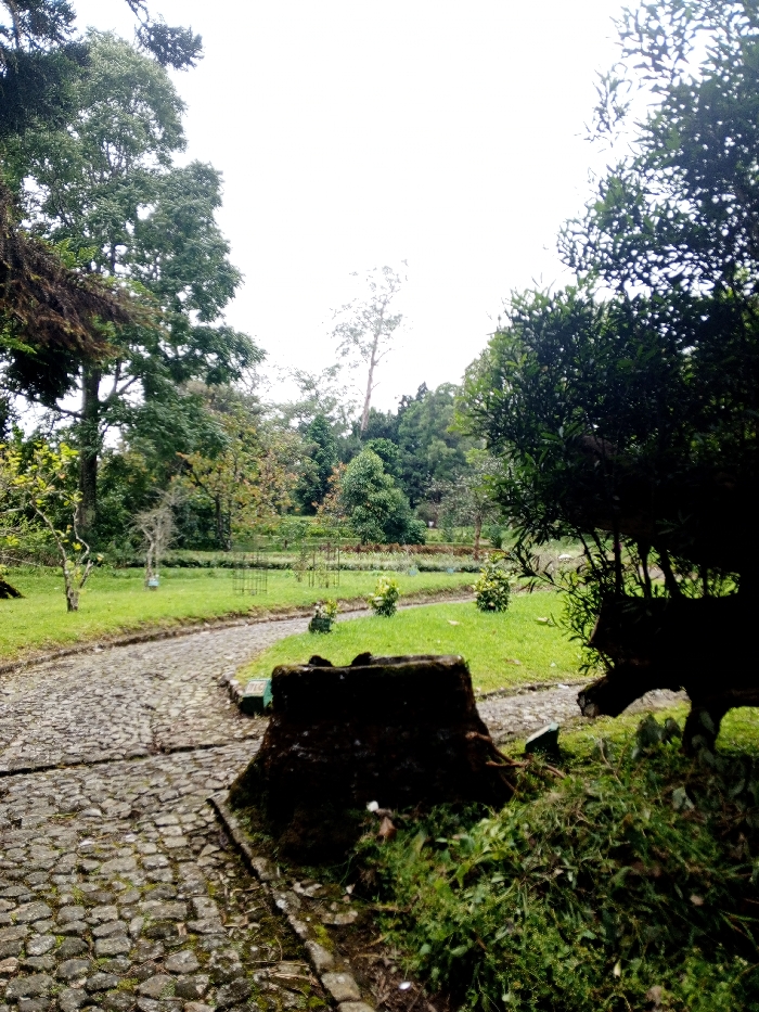 The image depicts a serene outdoor scene within a botanical garden or a large park in Đà Nẵng, Vietnam, under an overcast sky. A winding path, composed of irregular, moss-lined grey cobblestones, originates from the lower-left and curves towards the center-right background. In the immediate foreground, to the right of the path, a dark, heavily moss-covered tree stump approximately 0.5 meters in height is prominent. Adjacent to the stump, a mass of dark green foliage is visible. The path is flanked by expansive, well-maintained green grassy areas. Across these lawns, several small, newly planted shrubs are discernible, some protected by light-colored, square wire frames. The midground features a variety of mature trees with dense green canopies, forming a naturalistic park setting. In the background, a thick line of forest or dense vegetation creates a verdant backdrop, with one taller, light-colored tree trunk visible against the bright, featureless sky. No individuals, animals, or artificial structures other than the path and plant frames are visible within the frame.