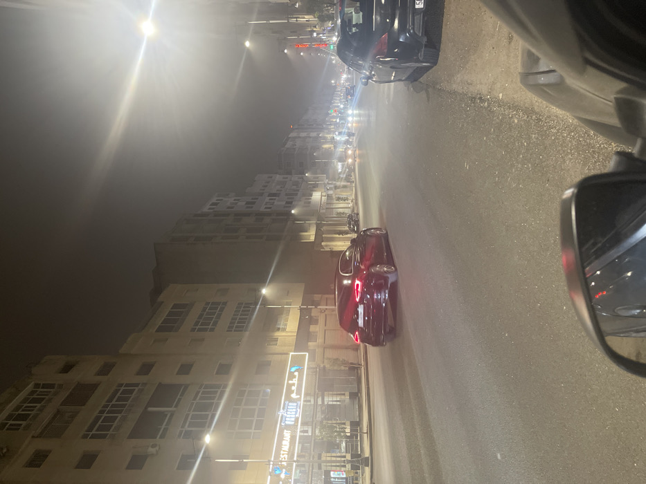 Night scene on a city street with low visibility due to fog. A dark red car is parked along the right side of the road, while a black car is ahead. The buildings lining the street are multi-story with lit windows. A street sign is visible in front of one of the buildings. A side mirror is visible on the right.