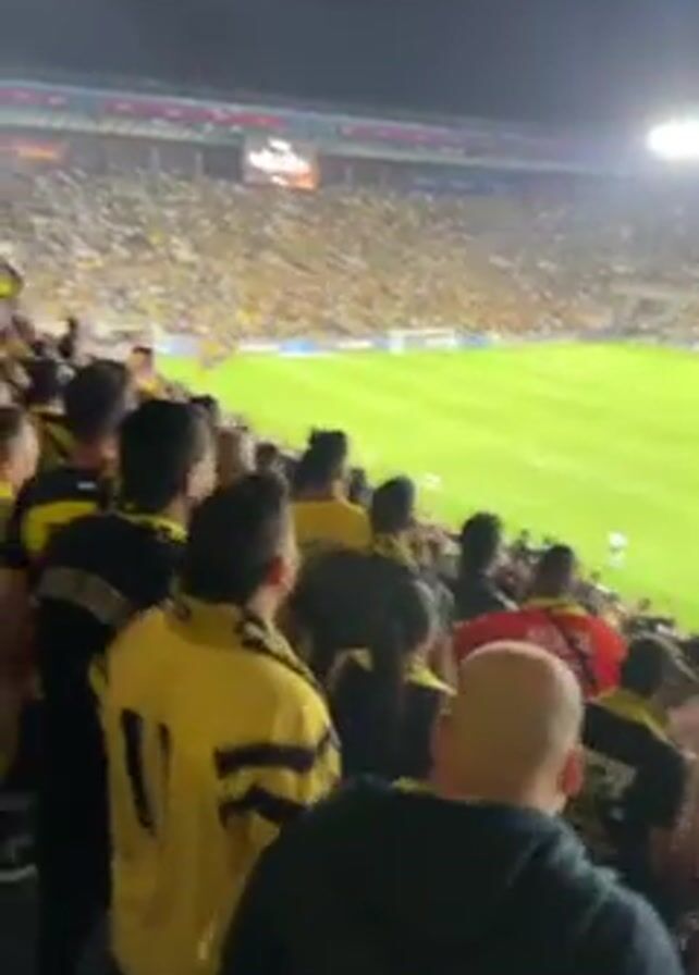 crowd of people, many wearing yellow and black shirts and scarves, standing in the stands of a brightly lit stadium during a soccer match. The camera is positioned amongst the crowd, looking out over the field. People are cheering, raising their arms, and chanting. The stadium is packed with fans, and the field is visible in the distance. The atmosphere appears energetic and enthusiastic.