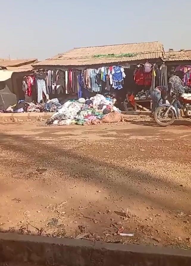 street market with clothes hanging on racks in front of small shops. In the foreground, there is a sidewalk and a dirt road. A large pile of clothes sits in front of the shops. People can be seen browsing through the clothes. A motorcycle is parked on the right side of the frame and a wheelbarrow is on the left side. In the background, there is a communication tower. The sky is clear. The scene is typical of an outdoor market in a developing country.