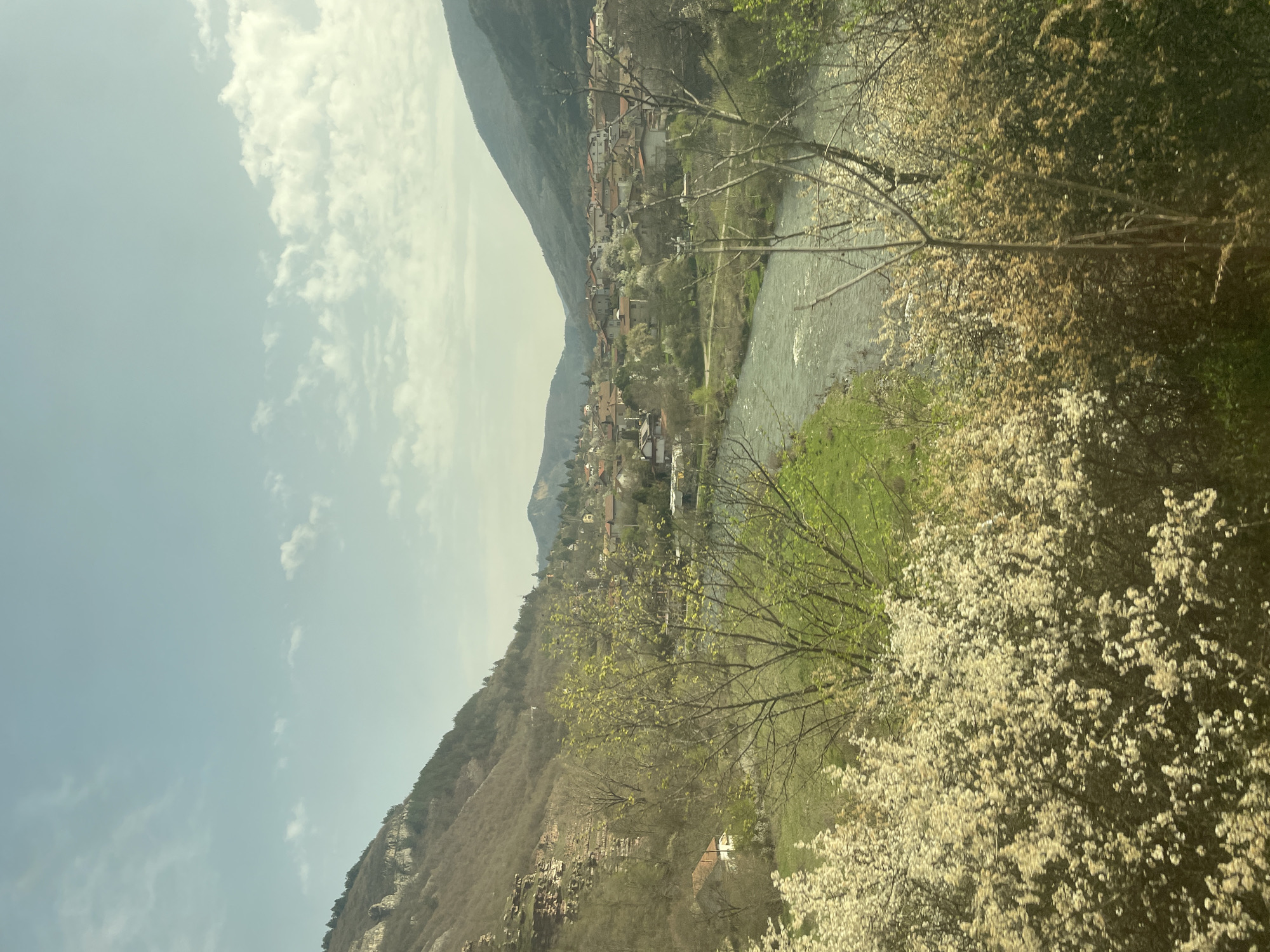 landscape in Tserovo, Bulgaria, featuring a river flowing through a valley. On the left side of the river, there is a hillside with a mountain peak towering above. A small town is nestled between the hillside and the river. The right side of the riverbank is covered in lush greenery and trees with white blossoms. The sky is partially cloudy with a light blue hue. There are no people visible in the image.