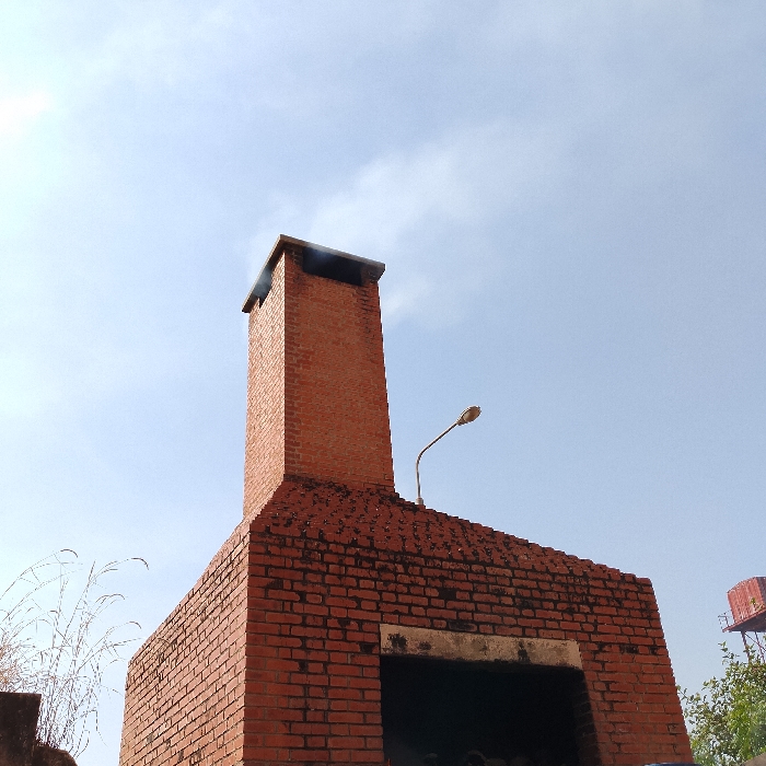 The image displays an outdoor scene in Barden Yana, Nigeria, under a bright, partly cloudy daytime sky. A tall, red-brick industrial structure dominates the frame, featuring a prominent rectangular chimney from which dark grey smoke is actively rising. The chimney is capped with a darker material and emerges from a larger, lower brick base that has a distinctive sloped roof section. A dark, recessed opening is visible at the lower front of this base, suggesting an access or combustion chamber. Mounted on the sloped brick roof is a street lamp fixture with a curved arm extending upwards and outwards. Sparse, dry, light-colored grasses are visible on the left side foreground, while green foliage and a portion of a reddish, elevated water tank are discernible in the background on the far right.