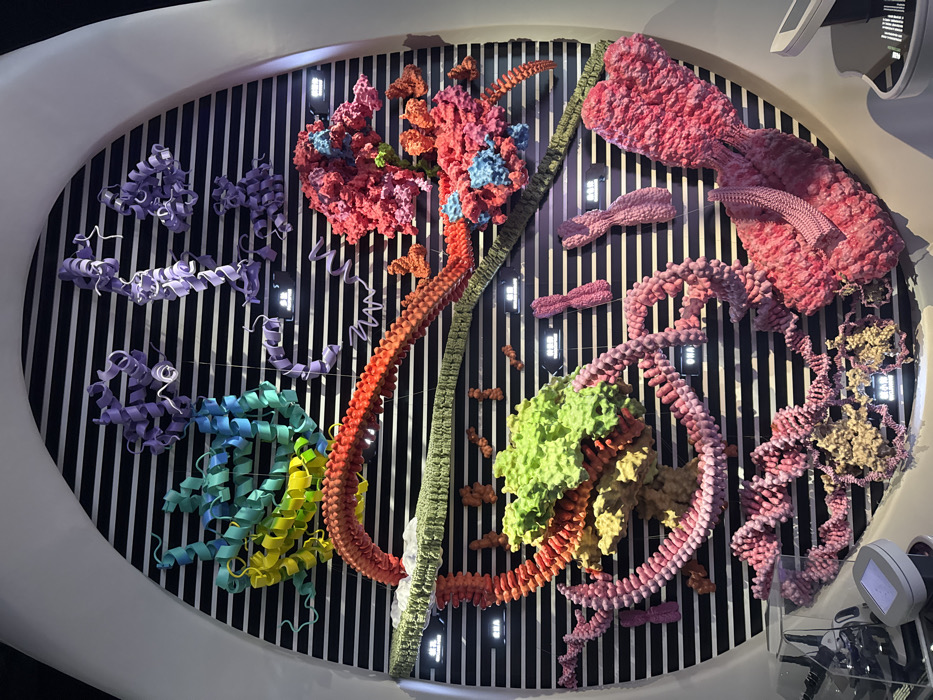 This image captures a brightly illuminated, wall-mounted exhibit located in Guangming District, China. The central subject is a large, oval-shaped display board featuring numerous three-dimensional, colorful models of biomolecules and cellular structures. The background of the display consists of a black surface with thin, evenly spaced horizontal white stripes. Various macromolecular models are suspended or mounted across the striped background. In the upper left quadrant, a large, intricate coiled structure transitions from yellow to green to blue, likely representing a complex protein. To its right, several smaller, purple helical and globular structures, also representing proteins, are visible. Mid-level, a long, segmented red-orange chain, likely RNA, extends horizontally across the display, appearing to interact with a textured green band, possibly a membrane or a large complex. Below this, smaller orange rod-like structures are present. In the mid-right, several large, irregular, predominantly pink and red masses with blue highlights suggest complex protein assemblies or ribosomes. The lower half of the display features a prominent structure composed of bright green and tan components, possibly a nucleosome or protein-DNA complex, from which a pink, helical chain (DNA) extends and coils. Further to the lower left, more intricate pink double-helical structures, clearly representing DNA, are intertwined with beige, globular forms, indicative of histones. Small white rectangular plaques with black Chinese characters are distributed throughout the display, identifying various models such as "蛋白质" (protein), "RNA," "DNA," and "染色体" (chromosome). Two distinct pink, X-shaped structures, unequivocally chromosomes, are displayed in the lower mid-right. A large, textured pink mass occupies the lower right, potentially depicting a larger cellular component. No people are visible. The models are static, arranged for informational display within what appears to be a museum or science exhibition environment. A subtle reflection is present on the lower portion of the display, suggesting a protective barrier. A small white device with a visible screen, possibly an interactive console, is partially visible on a counter beneath the display in the lower left corner.