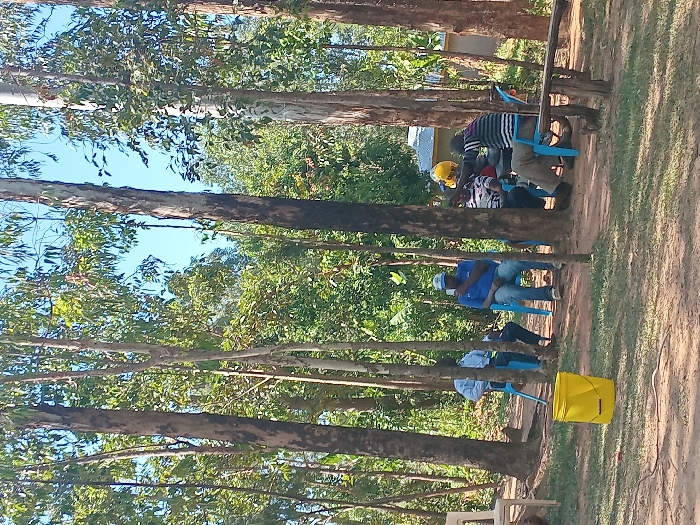 A group of people are gathered outdoors, seated in blue plastic chairs under the shade of tall, thin trees. Most are wearing casual clothing; one person has on a yellow hardhat. A yellow bucket sits near the front row of chairs. The ground is covered in dirt or grass, and there are patches of sunlight. In the background, there are more trees and a building with a light-colored roof.