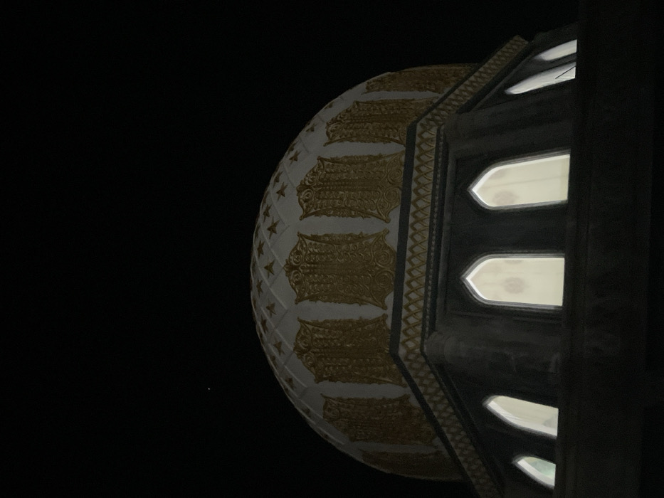 An illuminated architectural dome dominates the right side of the image against a stark black sky. The dome features white segments adorned with ornate gold detailing. To the right of the dome, a section of a building or tower is visible, constructed with a series of arched windows filled with light. The color palette consists primarily of dark tones, contrasting with the brighter white and gold elements of the dome and the illuminated windows.