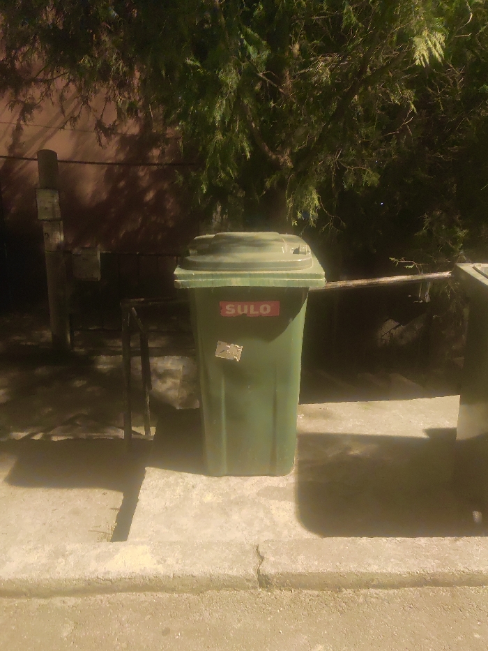 - "The image displays a dark green waste bin situated on a concrete sidewalk in Sveti Vlas, Bulgaria" by FM-ZFQVz1, licensed under CC BY 4.0