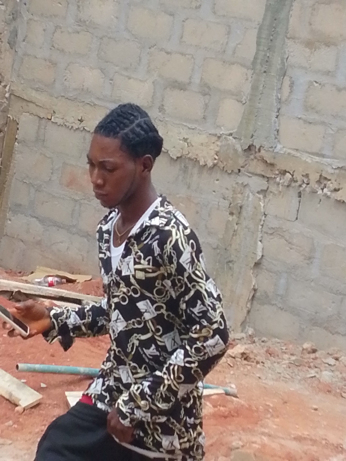 A male individual is depicted outdoors in Enugwu-Ukwu, Nigeria, against an unfinished light-colored concrete block wall