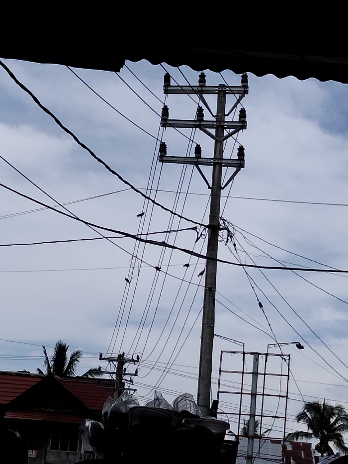 A tall utility pole dominates the frame, its structure composed of stacked insulators and multiple crossbars. Numerous electrical wires extend from the pole, creating a tangled web against a cloudy sky. Several birds perch on these wires and the pole itself. Below, silhouettes of buildings and trees, including palm trees, are visible. Part of a dark awning is visible in the upper portion of the frame. The lighting is muted, contributing to a somewhat gloomy atmosphere.
