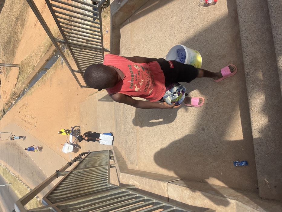 The image captures an outdoor scene on a pedestrian overpass or footbridge in Kuchingoro, Nigeria, under bright daylight