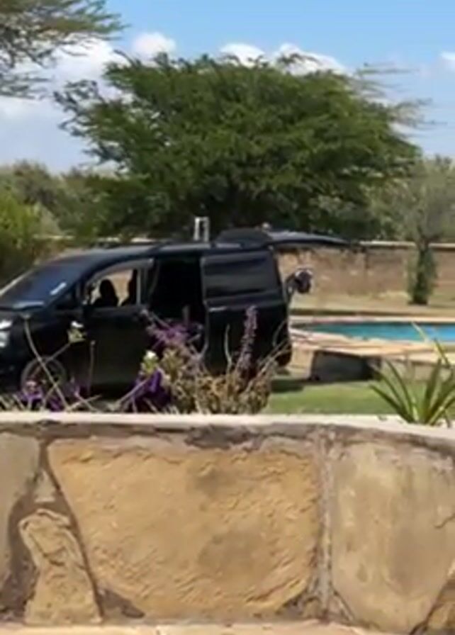 A person films a black minivan parked next to a swimming pool, with an additional person reclining on the grass, partially obscured by bushes