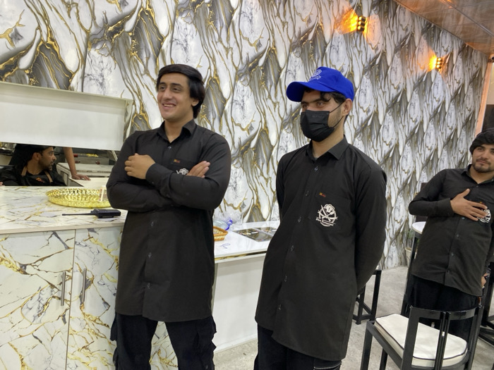 Three men are visible. Two men wear matching black button-down shirts with an emblem on the upper left chest and black pants. The man on the left has his arms crossed and smiles. The man in the middle wears a blue cap and a black face mask. The third man is slightly blurred on the right, wearing a similar shirt and holding his chest. They appear to be in a store or restaurant. The background features a marble countertop and a decorative wall.
