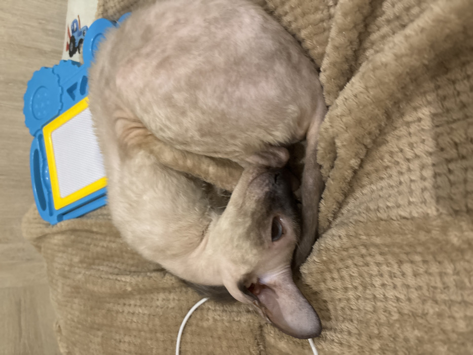 - "The image displays a domestic cat, identified by its sparse fur and large ears as likely a Sphynx or similar breed, resting curled up on a light brown, textured blanket" by FM-oAmG62, licensed under CC BY 4.0