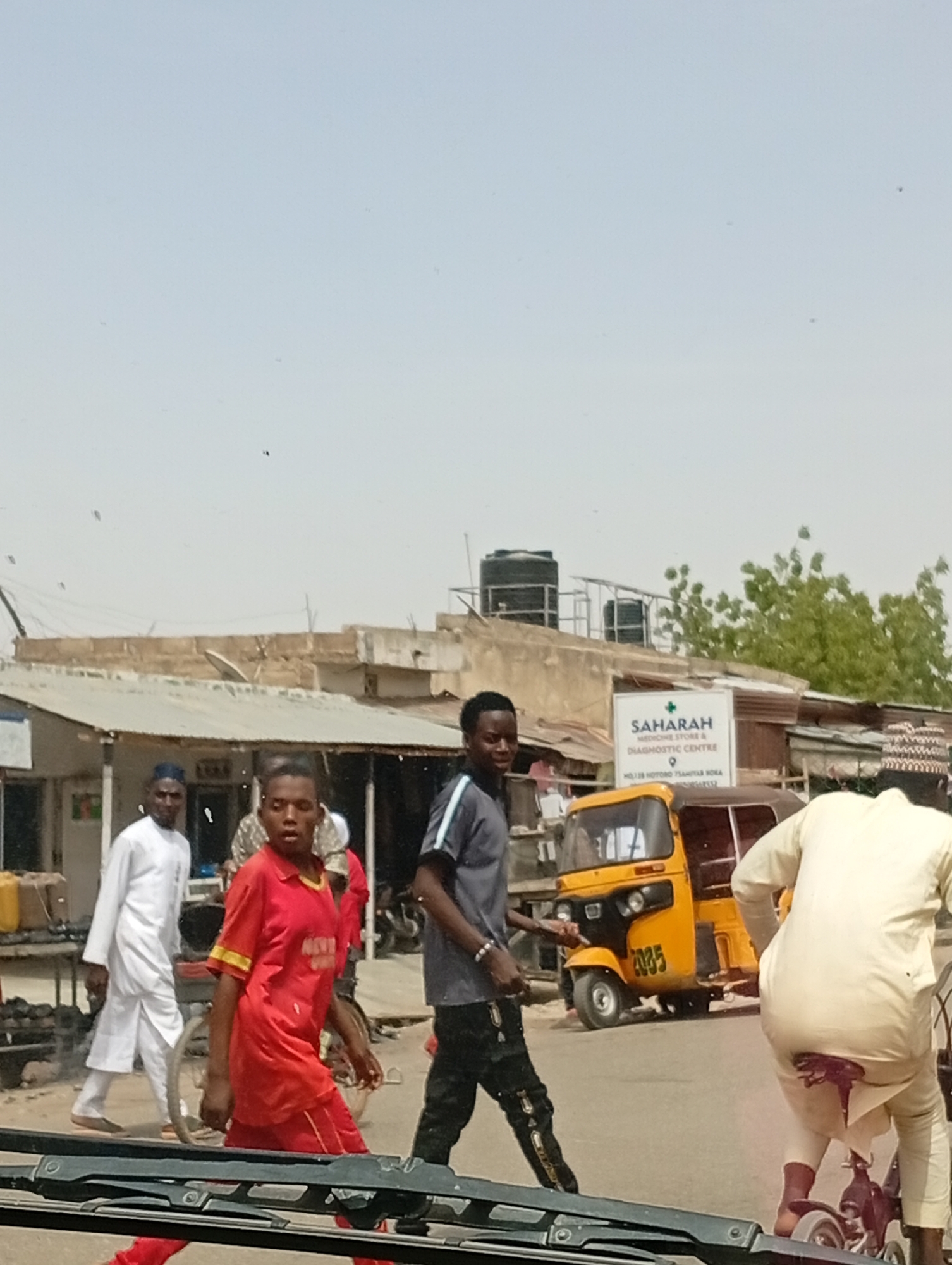 The image depicts a daytime street scene in Hotoro North, Nigeria, specifically at or near 128 Hotoro Tsaunar Roka, as indicated by a sign for "SAHARAH MEDICINE STORE & DIAGNOSTIC CENTRE." The environment is characterized by a bright, hazy sky, and a street with multiple pedestrians and a yellow auto-rickshaw. In the immediate foreground, a black vehicle dashboard or frame partially obscures the lower portion of the scene. Four prominent individuals are visible: 1. **Left foreground**: A young male in a red short-sleeved shirt with a yellow-striped collar and red pants, walking towards the right of the frame, looking towards the camera. 2. **Mid-ground left**: A male in a long white traditional garment and a dark cap, walking from left to right. 3. **Mid-ground center-right**: A young male in a grey t-shirt with dark shoulder stripes and dark pants with white stripes, walking from right to left, looking towards the camera and smiling. 4. **Right foreground**: A male, seen from behind, riding a small red scooter or bicycle. He is wearing a light beige traditional garment (likely a kaftan or agbada) that has a dark, possibly torn, section or object protruding from its lower back. His head is out of frame. Behind these individuals, a yellow auto-rickshaw (often called a Keke Napep) with the number "7035" visible on its front, is either parked or moving slowly on the street. The background features various single-story buildings with corrugated metal roofs, some appearing to be shops or residences. Overhead, electrical wires are visible. On the rooftops, dark water tanks are present. Green trees are visible to the far right, behind the buildings. A yellow container is positioned on a stand to the far left. The scene indicates active street life with pedestrian and light vehicle movement.