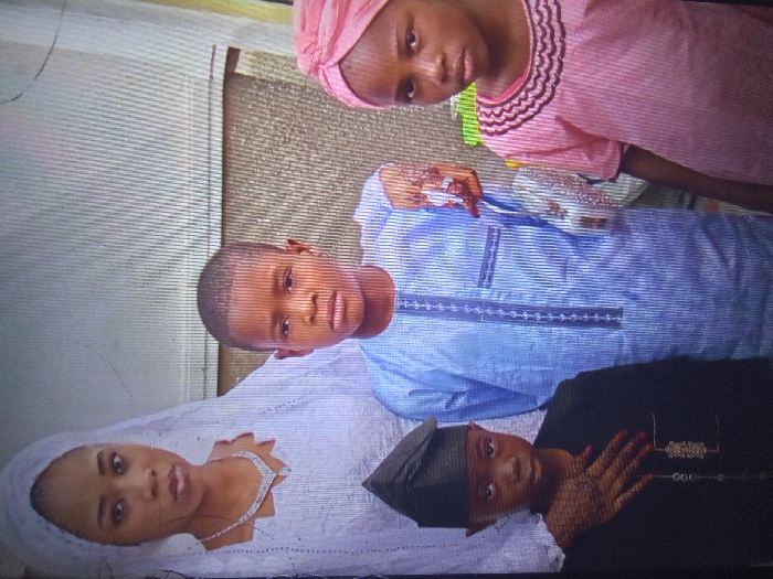 Four people, likely family members, pose for a portrait. An adult woman lies on a white cloth, wearing a matching head covering and necklace. Three children are positioned above her. One child, in a light blue shirt, stands centrally. Another child wears a pink top and headwrap. The last child, in a dark outfit and hat, rests their hand on their chest. The photo appears to be taken from a television screen.