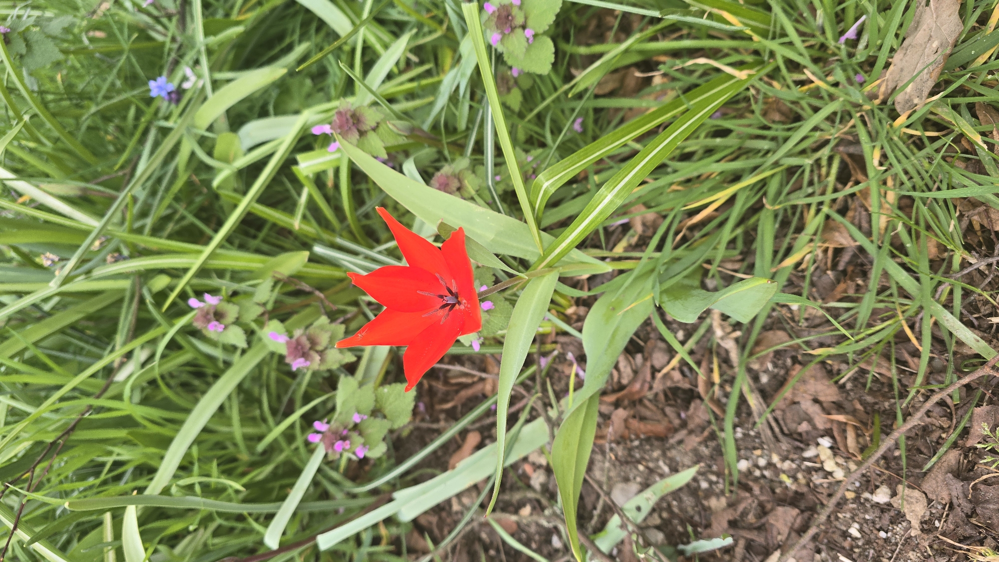 A single, open red flower with six pointed petals and a dark, nearly black center is prominently featured in a close-up, vertical composition. The flower is supported by a slender green stem and surrounded by several broad, light green leaves emanating from its base. The immediate environment consists of a dense mixture of green vegetation, including taller, narrow-bladed grasses, some of which exhibit distinct light green and white longitudinal stripes. Scattered among the grasses are clusters of smaller plants with dark green, rounded leaves and small purplish-pink flowers. A single small blue flower is visible in the upper background, partially obscured by the green foliage. The ground beneath the vegetation is comprised of dark brown soil, interspersed with fallen brown leaves and small twigs, indicating organic ground cover. The scene is located in the city of Helmond, Netherlands.