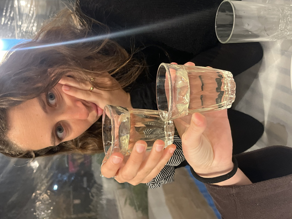 This image captures two individuals at a table within an establishment in Megalochori, Greece. A woman with wavy brown hair, wearing a black long-sleeved top, occupies the upper portion of the frame. Her left hand extends forward, holding a small, clear, faceted glass containing a translucent liquid. Her right hand rests against her face, and she looks directly at the camera with wide eyes and slightly pursed lips. A gold ring is visible on her right ring finger, and a black and white striped scrunchie is on her left wrist. The left hand and forearm of a second individual, clad in a dark brown long-sleeved garment and a black wristband, are visible in the lower left, holding an identical clear glass with translucent liquid. An empty matching glass rests on the white tabletop to the lower right. The background features blurred lights observed through a transparent enclosure, indicating an indoor or enclosed outdoor setting, likely during nighttime.